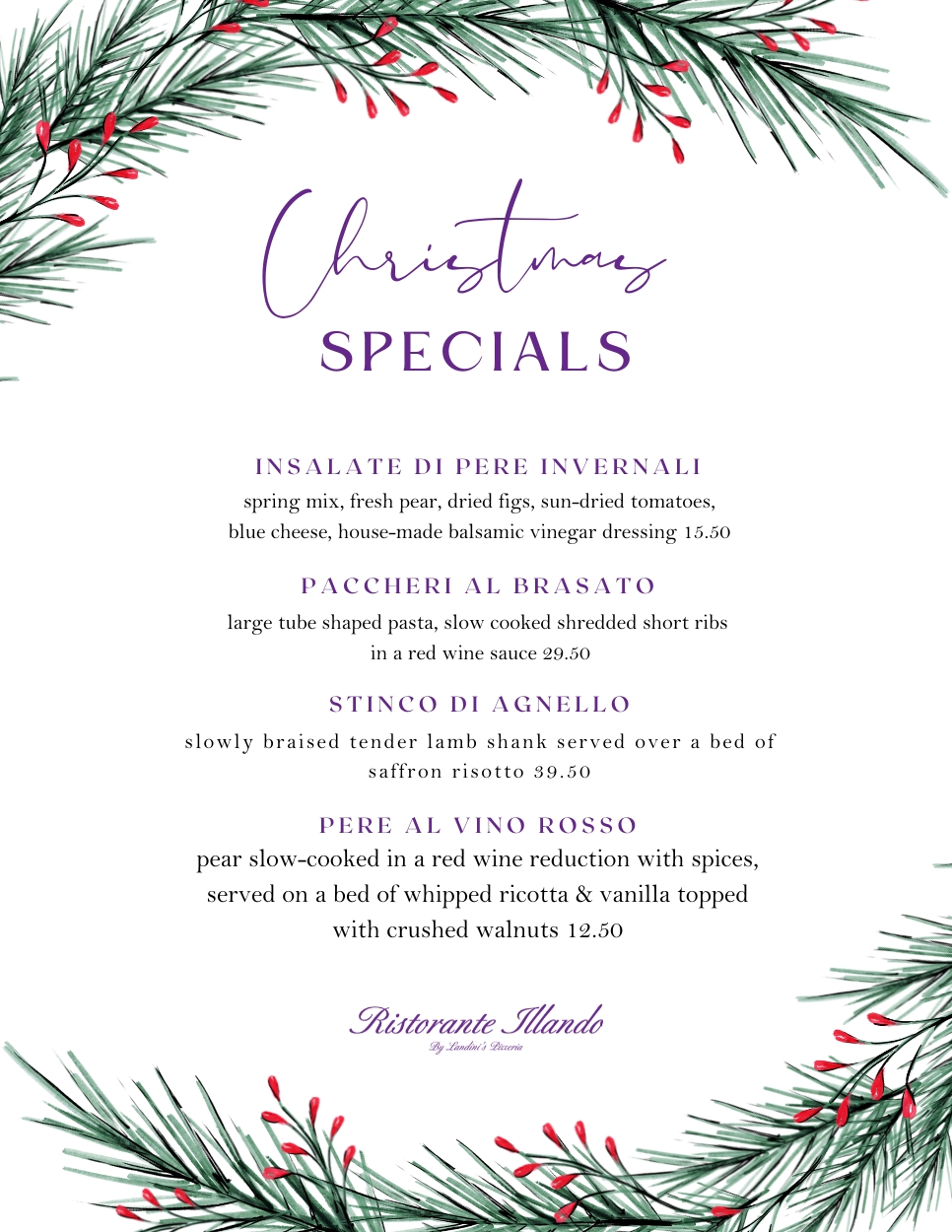 Ristorante Illando welcomes the holiday season with a thoughtfully curated Christmas Specials Menu, showcasing comforting Italian flavors, seasonal ingredients, and time-honored techniques. Designed to complement Illando’s classic Little Italy atmosphere, the menu highlights rich winter dishes and elegant desserts meant to be shared, savored, and enjoyed with family and friends. *Availible beginning December 24th* *Regular Menu Available Christmas Day*